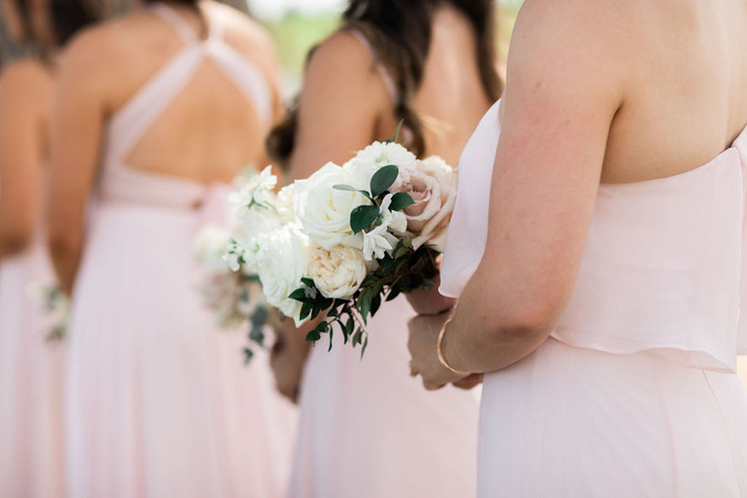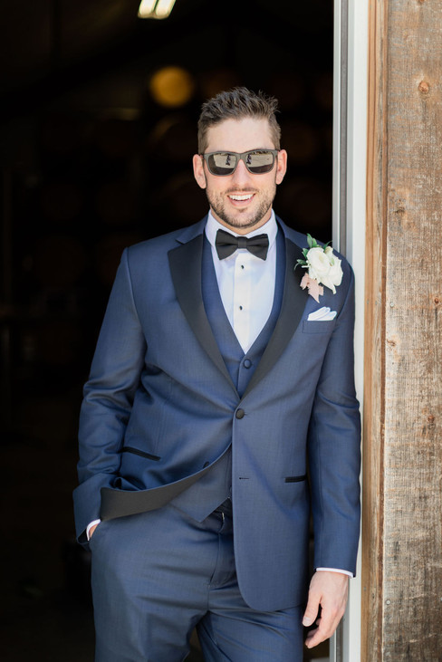 The warm summer afternoon was perfect weather for a sweet and intimate exchange of vows in the presence of all their family and friends. The aisle was framed on either side by wine barrels with gorgeous floral arrangements on top, with the picturesque oak tree and vineyard as the backdrop. The color palette was a light and elegant combination of blush and navy blue, which brought a beautiful balance to the wedding party attire for family pictures.
